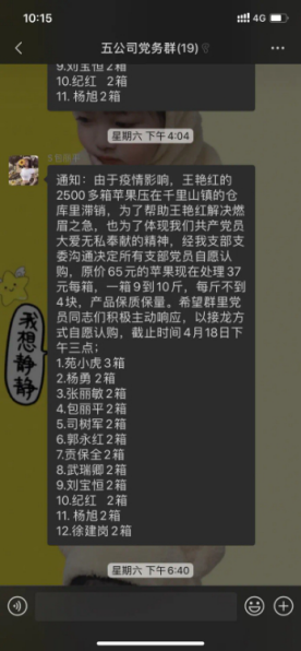 4月18日,烏海廣播電視臺(tái)公眾號(hào)發(fā)布一條《急急急!2萬(wàn)多斤評(píng)估滯銷(xiāo),快來(lái)幫幫這個(gè)烏海姑娘!》信息,我市一位名叫王艷紅的農(nóng)戶(hù)從新疆果園運(yùn)回近3000箱阿克蘇冰糖心蘋(píng)果,受今年新冠肺炎疫情影響,2500多箱蘋(píng)果一直壓在千里山鎮(zhèn)的倉(cāng)庫(kù),隨著天氣轉(zhuǎn)暖,錯(cuò)過(guò)最佳售賣(mài)時(shí)機(jī),保鮮庫(kù)也存放不了多久,王艷紅焦急萬(wàn)分,到處找銷(xiāo)路。市熱力有限責(zé)任公司第五分公司黨支部書(shū)記苑小虎得知這一消息后,第一時(shí)間與支部委員商議,最終決定以接龍方式在公司微信群開(kāi)展自愿認(rèn)購(gòu)活動(dòng)。