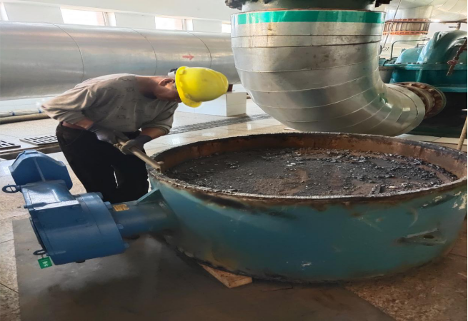 1#循環(huán)泵可以說是隔壓站之重器,2016年安裝投入使用,已連續(xù)穩(wěn)定運(yùn)行3個(gè)采暖季。額定流量5000T/H,工作揚(yáng)程80米,非嚴(yán)寒期單臺(tái)泵運(yùn)行就可以滿足1000萬㎡的供熱任務(wù)。因連續(xù)工作水泵機(jī)械密封磨損老化出現(xiàn)漏水,2020年隔壓站將1#循環(huán)泵的維修列為重點(diǎn)檢修工程。8月31日,邀請(qǐng)水泵維修專業(yè)技術(shù)人員到場(chǎng)在隔壓站機(jī)修人員的配合下對(duì)水泵進(jìn)行維修。