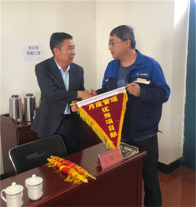 城建公司副總經(jīng)理龔宇為第二名頒發(fā)《月度管理優(yōu)秀項(xiàng)目部》榮譽(yù)稱號(hào)(圖左城建公司副總經(jīng)理龔宇;圖右項(xiàng)目經(jīng)理崔成志)