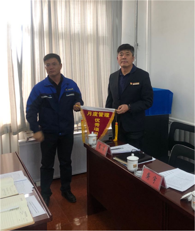 城建公司副總經(jīng)理龔宇為第二名頒發(fā)《月度管理優(yōu)秀項(xiàng)目部》榮譽(yù)稱號(圖左城建公司副總經(jīng)理吳健;圖右項(xiàng)目經(jīng)理付文寧)