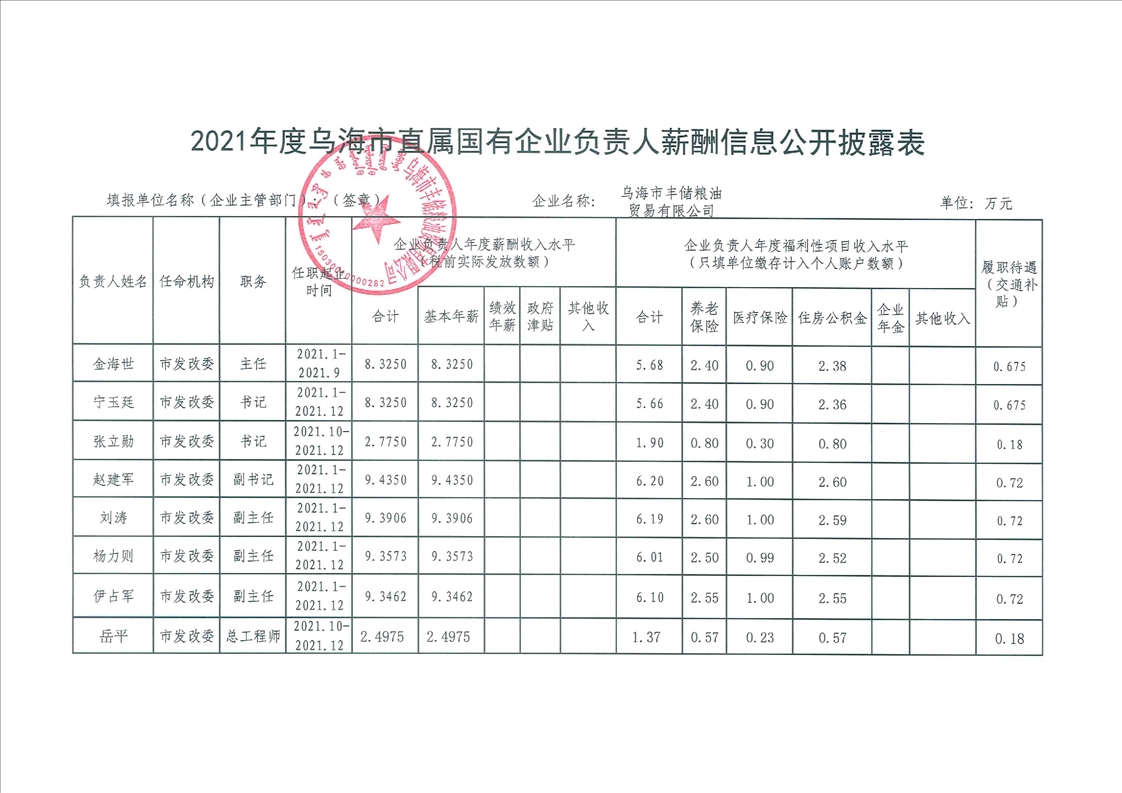 烏海市豐儲(chǔ)糧油貿(mào)易有限公司2021年度企業(yè)負(fù)責(zé)人薪酬信息公開披露表