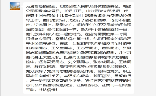 城建公司黨支部對(duì)本次在疫情防控值守中挺身而出、沖鋒在前的志愿者同志進(jìn)行表?yè)P(yáng),并號(hào)召全體黨員向他們學(xué)習(xí),牢記初心使命,踔厲奮發(fā)、勇毅前行,進(jìn)一步夯實(shí)黨支部戰(zhàn)斗堡壘。