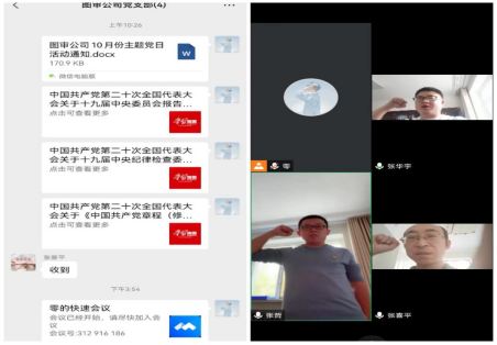 10月24日下午,集團(tuán)公司機(jī)關(guān)黨支部全體黨員、入黨積極分子共40名同志通過(guò)騰訊會(huì)議APP采取線(xiàn)上形式召開(kāi)主題黨日活動(dòng)。會(huì)議線(xiàn)下主會(huì)場(chǎng)由集團(tuán)公司閉環(huán)管理的12名黨員和積極分子組成,與線(xiàn)上的全體黨員首先進(jìn)行了主題黨日的前四項(xiàng)規(guī)定動(dòng)作,奮戰(zhàn)在抗疫一線(xiàn)的同志們帶領(lǐng)大家奏唱國(guó)歌、重溫入黨誓詞、領(lǐng)誦黨章、主動(dòng)繳納黨費(fèi)。之后,集團(tuán)公司黨委書(shū)記郝關(guān)峰,黨委委員、紀(jì)委書(shū)記張永東領(lǐng)學(xué)了《中國(guó)共產(chǎn)黨第二十次全國(guó)代表大會(huì)關(guān)于十九屆中央委員會(huì)報(bào)告的決議》《中國(guó)共產(chǎn)黨第二十次全國(guó)代表大會(huì)關(guān)于十九屆中央紀(jì)律檢查委員會(huì)工作報(bào)告的決議》《中國(guó)共產(chǎn)黨第二十次全國(guó)代表大會(huì)關(guān)于中國(guó)共產(chǎn)黨章程(修正案)的決議》。集團(tuán)公司機(jī)關(guān)黨支部書(shū)記喬娜通報(bào)了本次疫情防控工作相關(guān)情況。