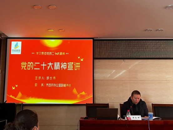 2023年1月18日,市政府辦公室副秘書長胡長偉到市城投集團公司開展學習宣傳貫徹黨的二十大精神宣講,市城投集團黨委書記郝關(guān)峰主持會議,集團公司領(lǐng)導(dǎo)班子成員,集團公司各部室正、副部長,機關(guān)黨支部全體黨員,各直屬黨組織書記及工作人員參加了本次宣講活動。