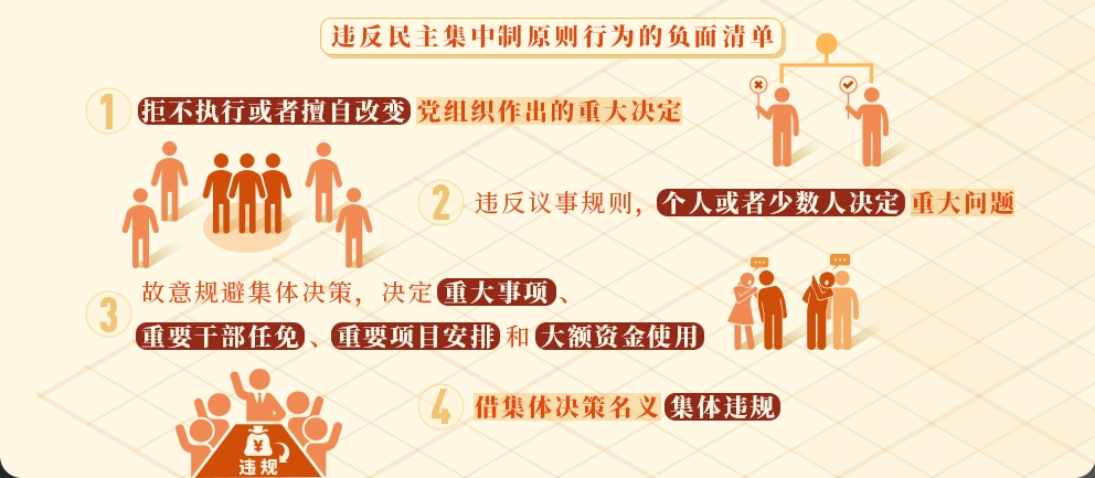 《中國共產(chǎn)黨紀律處分條例》第七十七條對違反民主集中制原則的行為作出處分規(guī)定??煞譃樗念悾?. 拒不執(zhí)行或者擅自改變黨組織作出的重大決定。重大決定,主要是指黨組織按照議事規(guī)則和決策程序作出的有關(guān)工作任務(wù)部署,干部任免、調(diào)整和處理等決定,對黨組織成員具有約束力,必須服從和執(zhí)行。只要有拒不執(zhí)行或者擅自改變當中任何一種情形,均構(gòu)成違紀。2. 違反議事規(guī)則,個人或者少數(shù)人決定重大問題。主要指違反黨章中“凡屬重大問題都要按照集體領(lǐng)導(dǎo)、民主集中、個別醞釀、會議決定的原則,由黨的委員會集體討論,作出決定”的規(guī)定,以及各級黨組織制定的具體議事規(guī)則和決策程序。3. 故意規(guī)避集體決策,決定重大事項、重要干部任免、重要項目安排和大額資金使用。故意規(guī)避集體決策,主要是指個人或少數(shù)人故意違反有關(guān)議事規(guī)則和決策程序,不以集體討論、會議決定的形式對職責(zé)權(quán)限內(nèi)的“三重一大”事項作出決策,或者緊急情況下由個人或少數(shù)人臨時決定,事后未及時向班子報告等。4. 借集體決策名義集體違規(guī)。這種違紀行為雖然符合集體議事規(guī)則和決策程序,但有集體違規(guī)決策的事實,集體決策程序成為掩飾集體違規(guī)目的的手段和幌子。黨是根據(jù)自己的綱領(lǐng)和章程,按照民主集中制組織起來的統(tǒng)一整體。嚴肅黨內(nèi)生活,最根本的是認真執(zhí)行黨的民主集中制。執(zhí)紀監(jiān)督中發(fā)現(xiàn),有的黨員領(lǐng)導(dǎo)干部我行我素、獨斷專行,對黨組織的重大決定置若罔聞;有的搞家長制、一言堂,習(xí)慣于逢事先定調(diào),重大問題不經(jīng)班子成員充分醞釀和討論就拍板,甚至對多數(shù)人的意見也置之不理;有的故意規(guī)避集體決策程序,把個人意見強加給集體、強加給組織,用個人決定代替組織決定;有的以“開會研究”為幌子,將集體決策程序作為掩飾集體違規(guī)的手段等。因此,《條例》明確對獨斷專行或各自為政,議而不決、決而不行、行而不實,以黨委集體決策名義集體違規(guī)等這些問題進行紀律責(zé)任追究,給予警告或者嚴重警告處分;情節(jié)嚴重的,給予撤銷黨內(nèi)職務(wù)或者留黨察看處分。