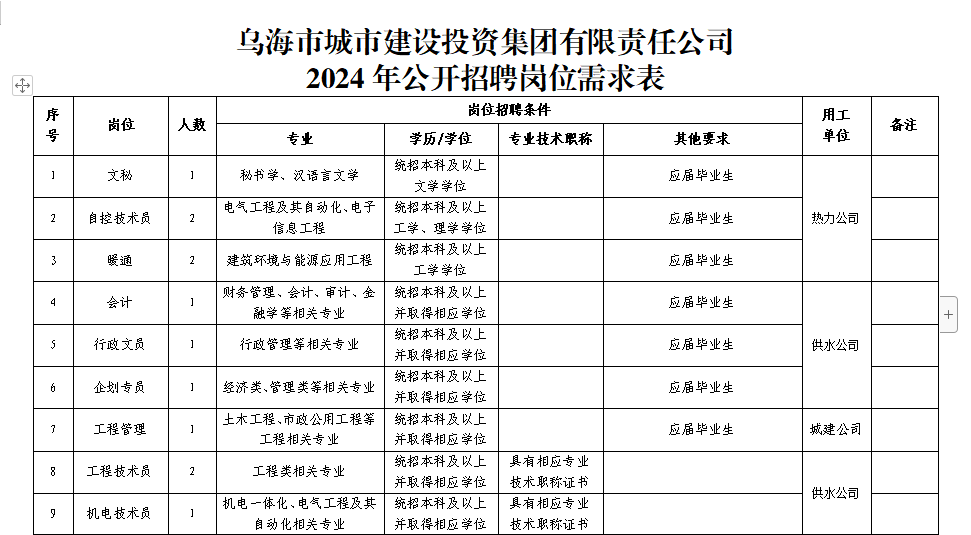 - 2024-08-19關(guān)于烏海市城市建設(shè)投資集團(tuán)有限責(zé)任公司 2024年公開招聘擬聘用人員公示的公告