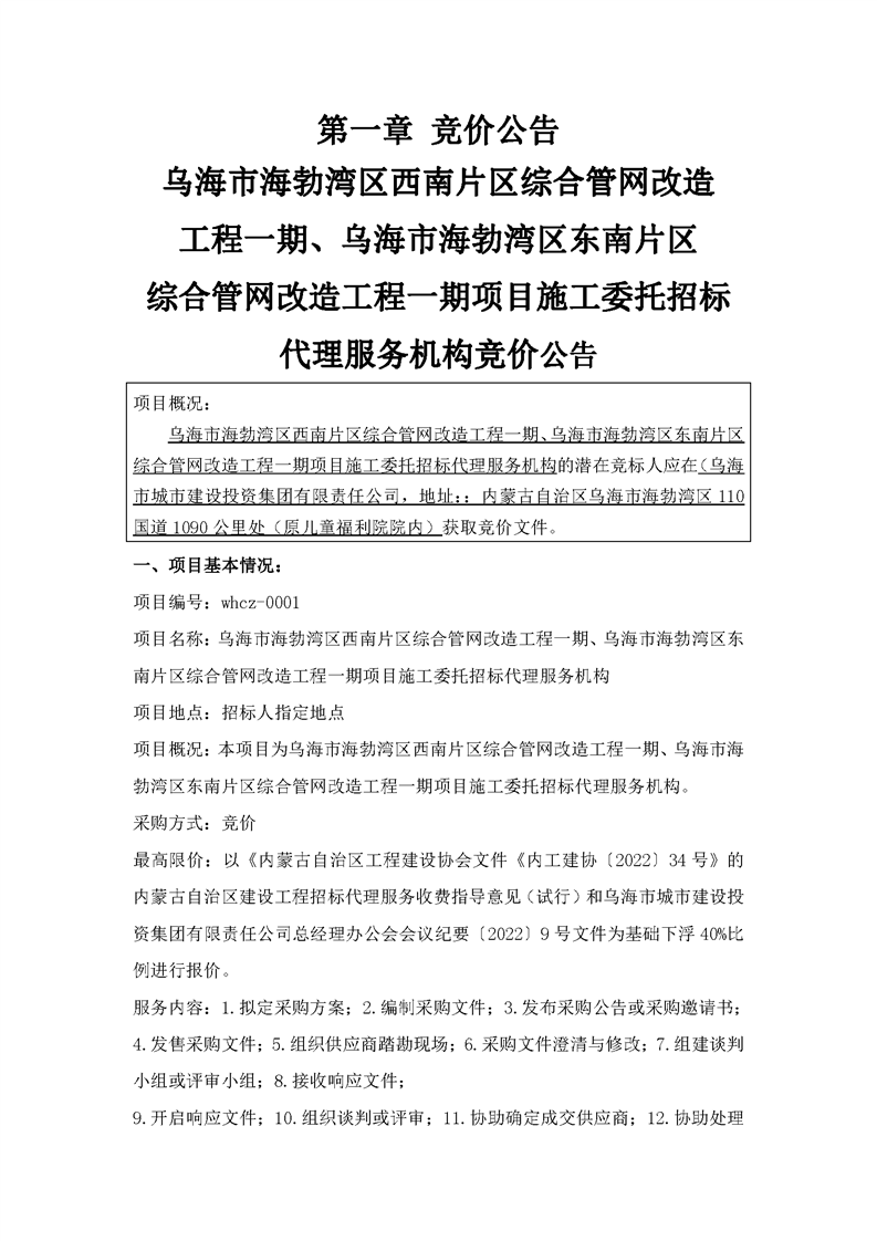 烏海市海勃灣區(qū)西南片區(qū)綜合管網(wǎng)改造工程一期、烏海市海勃灣區(qū)東南片區(qū)綜合管網(wǎng)改造工程一期項目施工委托招標(biāo)代理服務(wù)機構(gòu)競價公告