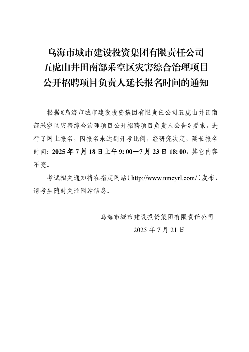 烏海市城市建設(shè)投資集團(tuán)有限責(zé)任公司五虎山井田南部采空區(qū)災(zāi)害綜合治理項(xiàng)目公開(kāi)招聘項(xiàng)目負(fù)責(zé)人延長(zhǎng)報(bào)名時(shí)間的通知