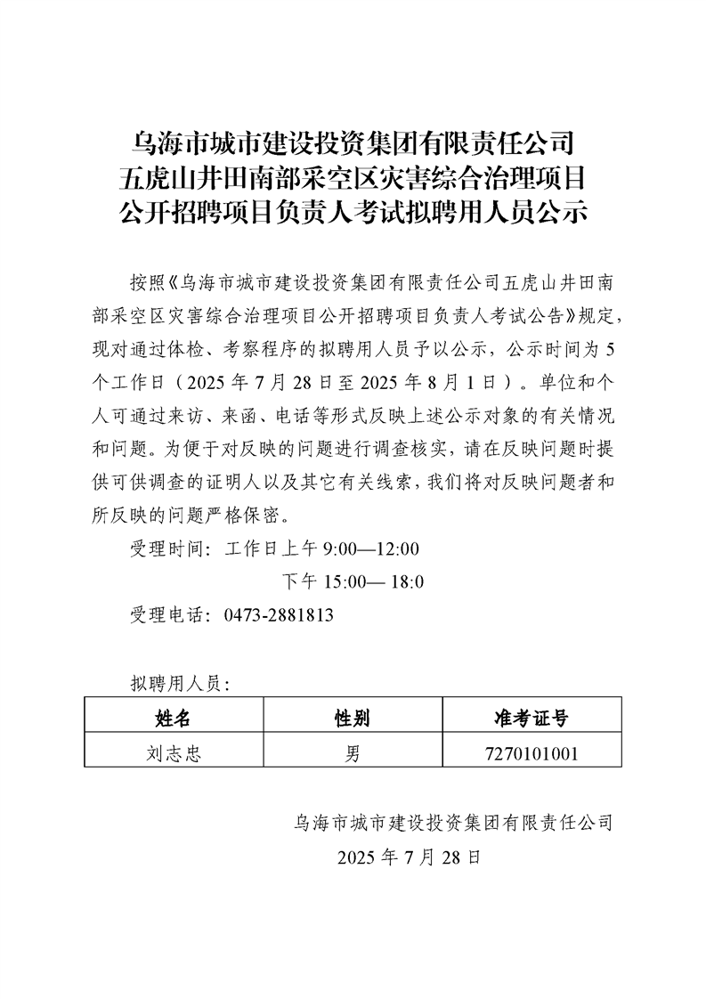 烏海市城市建設(shè)投資集團(tuán)有限責(zé)任公司五虎山井田南部采空區(qū)災(zāi)害綜合治理項(xiàng)目公開招聘項(xiàng)目負(fù)責(zé)人考試擬聘用人員公示